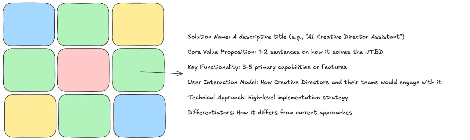 - Multi-Solution Synthesis: Multiple distinct product concepts emerge, each addressing the job-to-be-done through fundamentally different approaches that might serve different user segments or contexts.