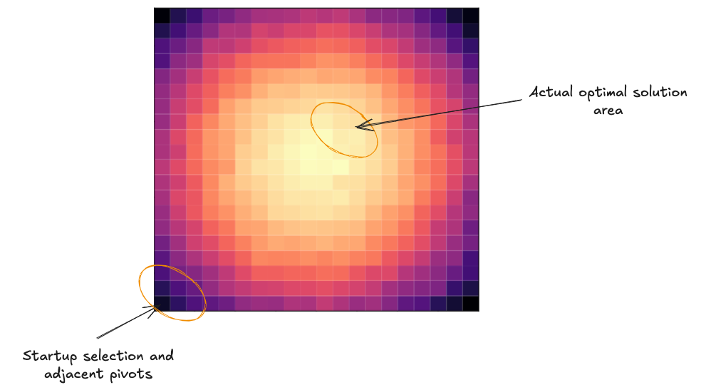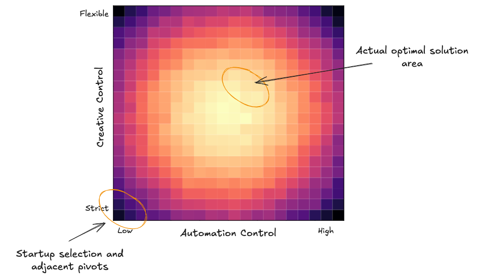 Without exploration, we prematurely converge on a single solution that is almost certainly incorrect, and pivoting in and around this initial solution won’t matter much if the actual solution lies in a completely different location within the distribution. When teams commit to specific implementations before systematic exploration, they cut off their optionality and dramatically reduce their chances of finding breakthrough value creation.