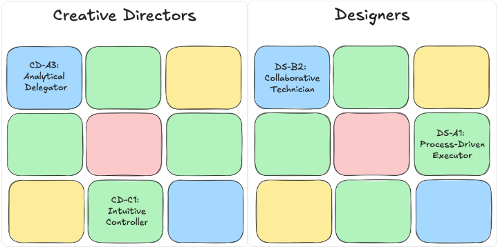 - Interaction patterns: How creative directors and designers align or diverge in their assessment of specific features reveals potential organizational dynamics