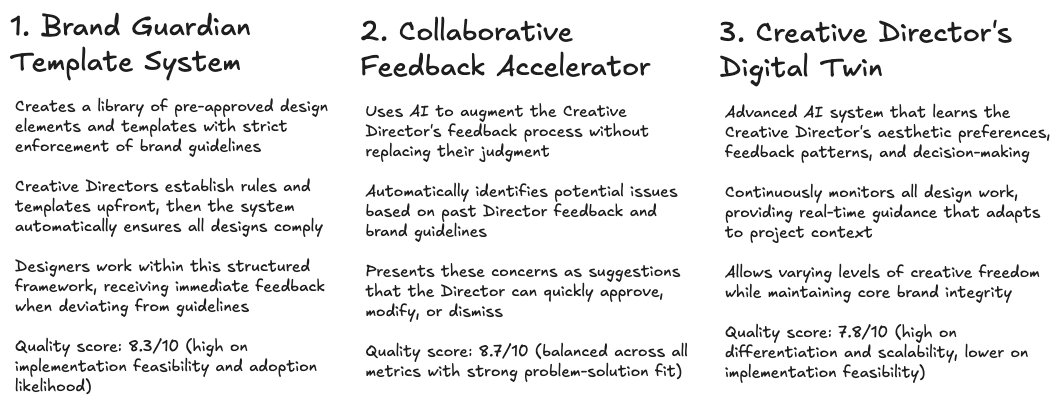 Each represents a fundamentally different approach to the creative director's core job-to-be-done, offering distinctive value propositions that address the problem from different angles. By selecting these high-contrast variants, we maximize the learning potential of our subsequent human testing phase.