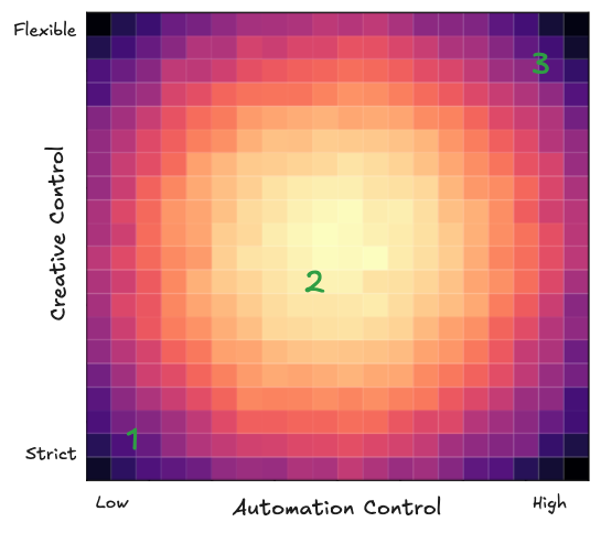 - Y-axis: Creative Control (Strict to Flexible) - how tightly the solution enforces brand guidelines and creative standards