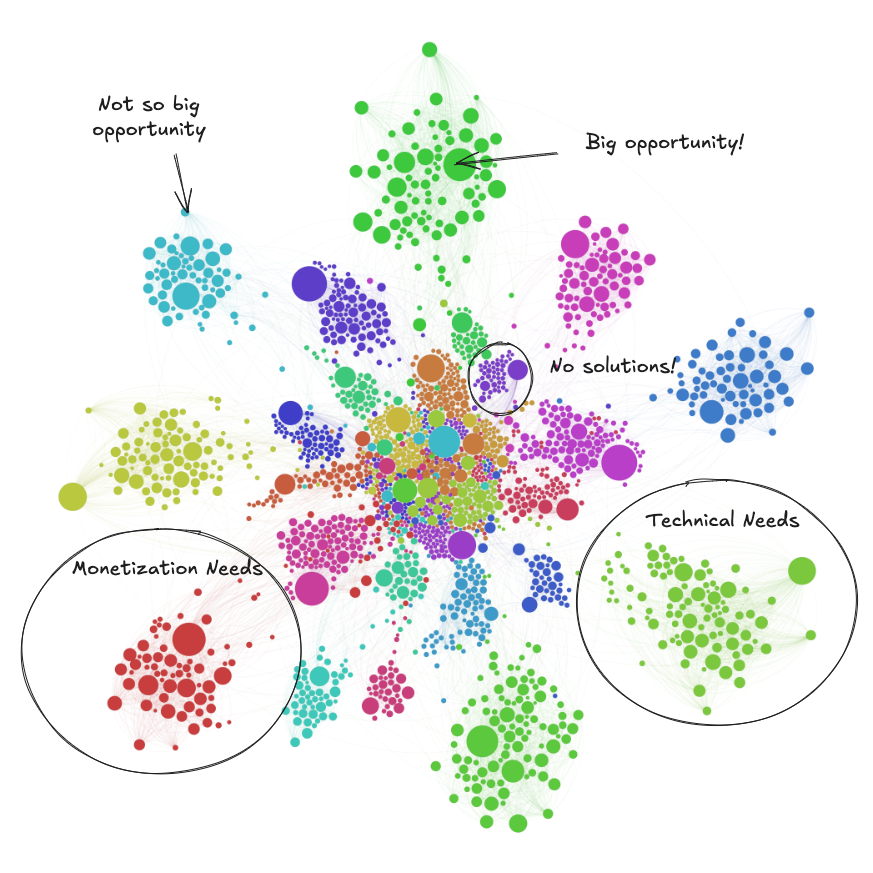 We can organize these JTBDs into various types of clusters: by type (monetization versus technical), by size (big versus not so big), and crucially, by how well current solutions actually deliver JTBD-curing solutions across multiple vectors: