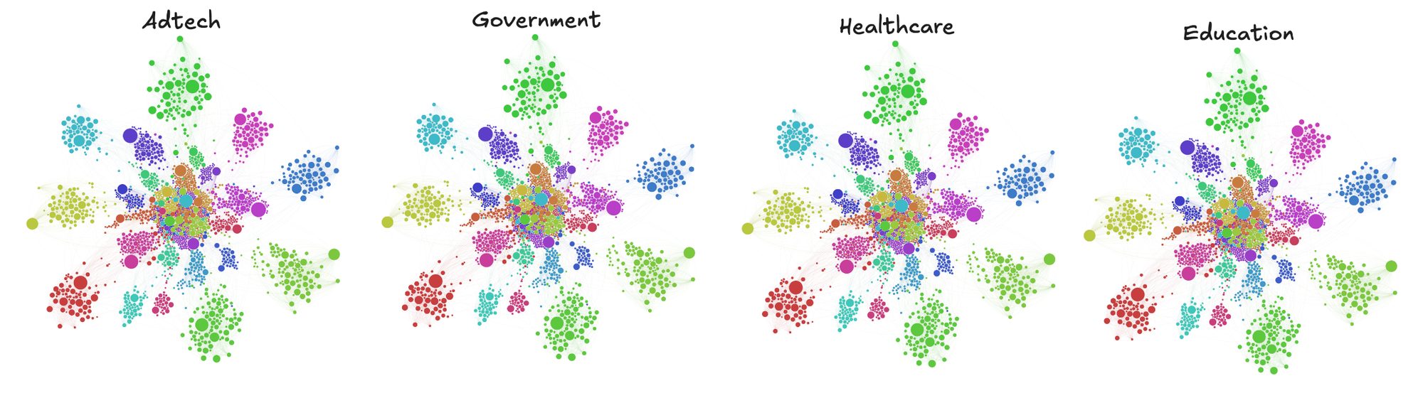 We’ve been talking about the approach generally, so let’s put some specifics against it. After synthesizing all publicly available data conducting 100s of (mostly) generative interviews, we might run a cluster analysis to better organize the 1000s of JTBDs that abound across the landscape, in this case focusing on Adtech (an area in which I’ve spent a good deal of time):