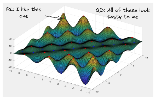QD operates a bit like a specialized team of explorers interested not in finding a single mountain but charting the entire range.