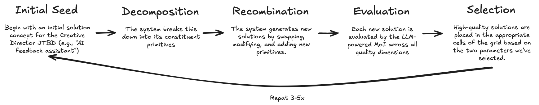 Let’s shift this from the conceptual back to the concrete. We begin just as the potentially doomed startup began - with the seed of an idea. Whereas the traditional startup takes that seed, commits to it, and starts building, we use that seed as, well, a seed - a starting point for our QD-powered discovery engine to begin its process. That engine, which we call Kensho, takes the initial idea and systematically mutates and evolves it until we’ve built a full archive of highly differentiated, high quality potential solutions: